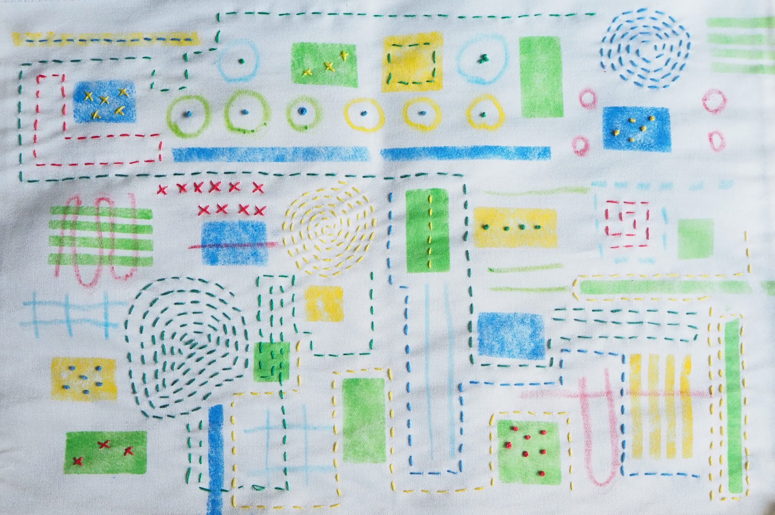 四角形はいろいろなバージョンがあるので面白い形です。 真四角、横に長い四角、縦に長い四角。大きくしたり、小さくしたり。 ひとつひとつが「おうち」のように見えるのは私だけでしょうか。 いろいろな四角をステンシルで散らして、思い思いに刺しゅうをしていきます。 四角と刺しゅう 家と家の間を通って「どの道を通ろうかな」と思って刺し始めます。 たまにはこの家に寄ってみようかな、と思いながら四角の中を寄り道したり。 ザクザクと刺しゅうする まるで迷路のように迷い込んでみるのも楽しい作業です。 ... -
