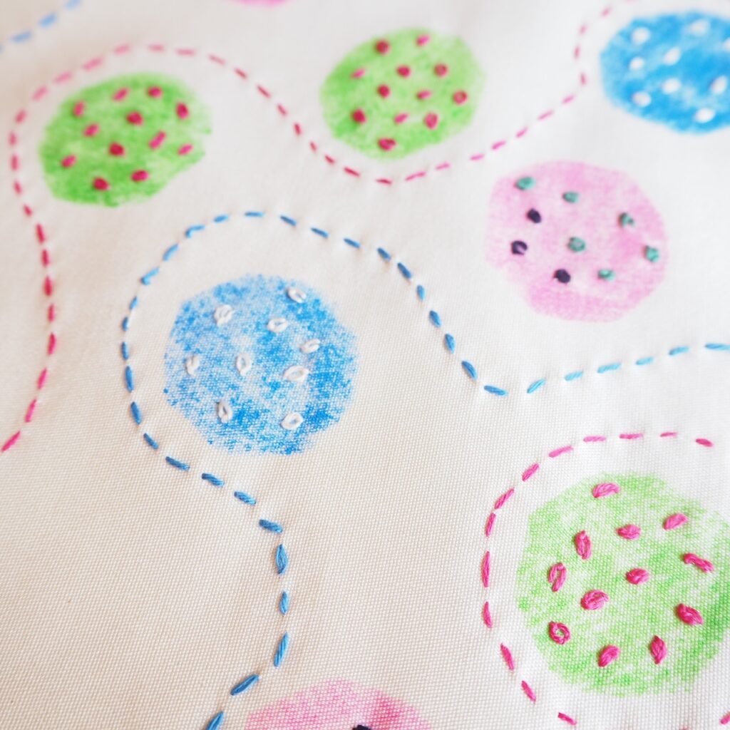 このサンプルは、ステンシルで丸を作り、その中にレーゼーデージーステッチでポツポツと刺しゅうをしています。