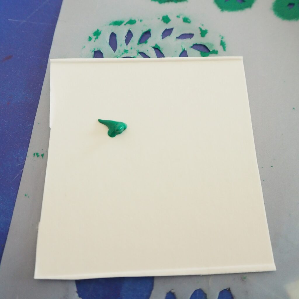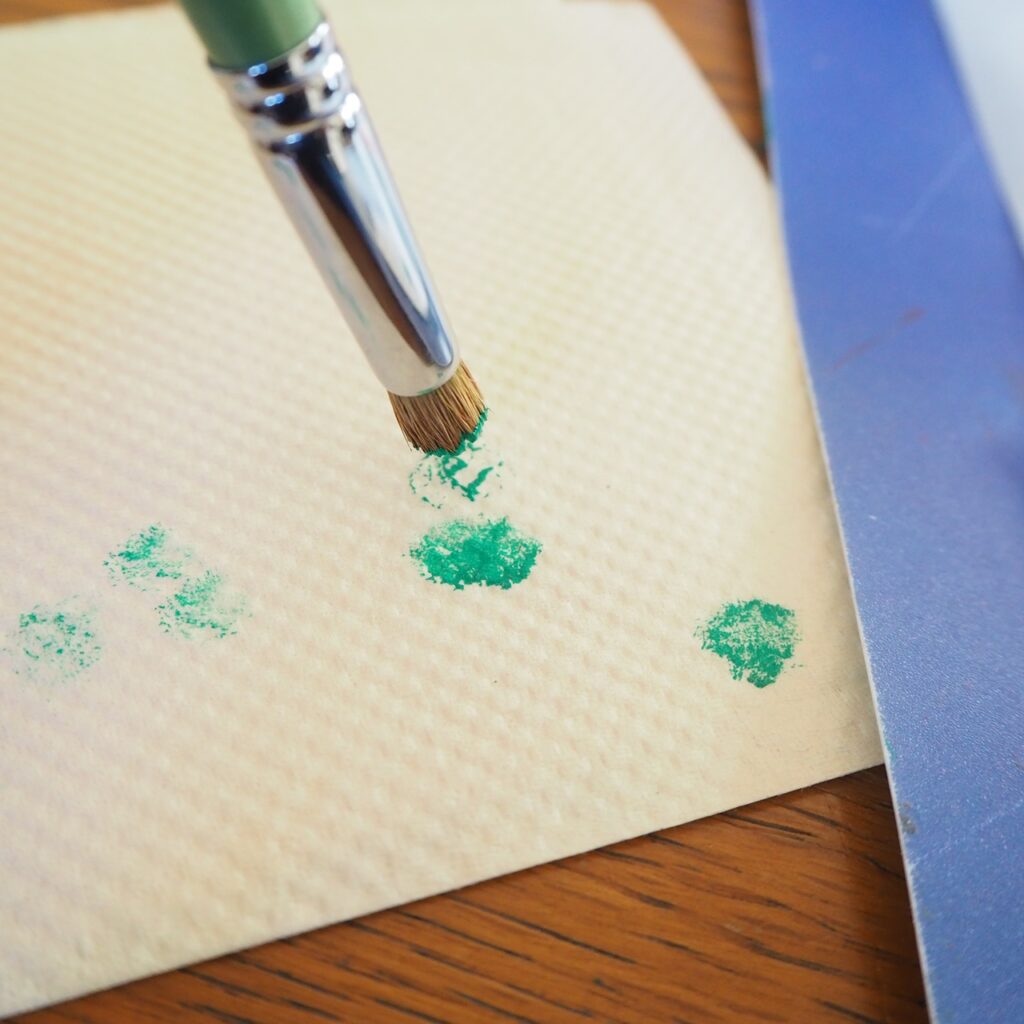 ほんの少しだけ出してみてください。ステンシルは少しずつブラシにつけてたたいていく方法なので、出しすぎはもったいないですから。