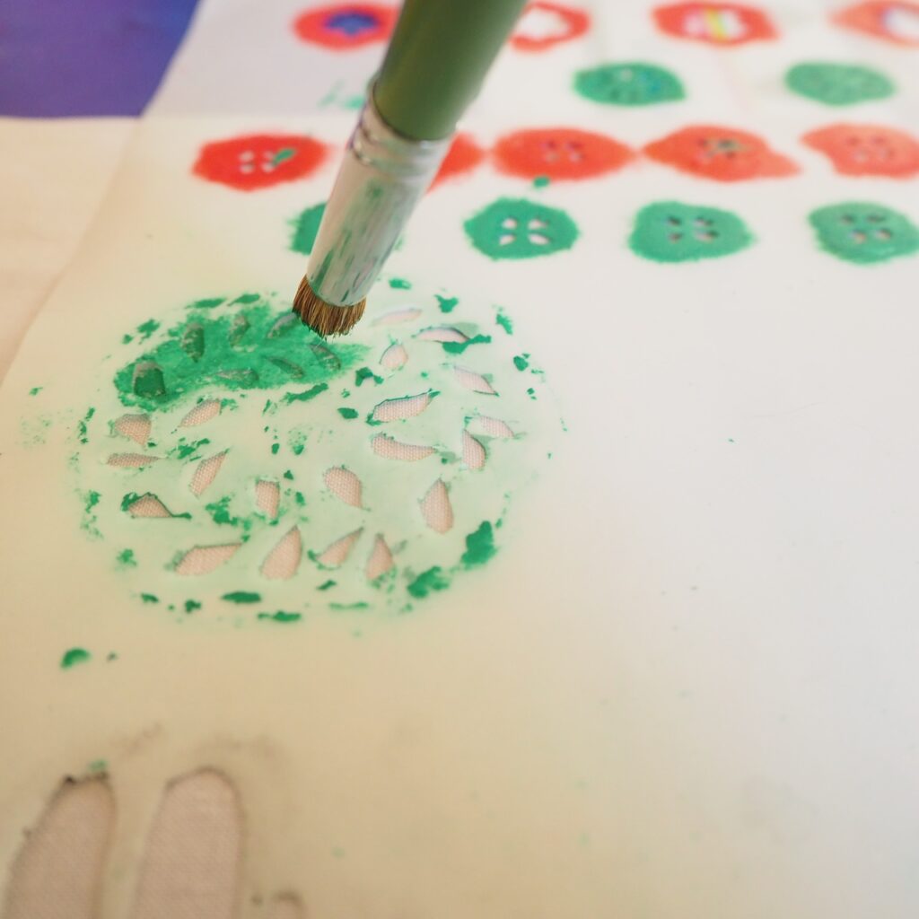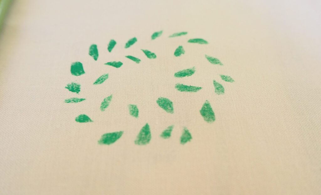 ステンシルは、優しい気持ちでポンポンと叩いていきます。気持ちが優しいと、仕上がりも優しくなります。