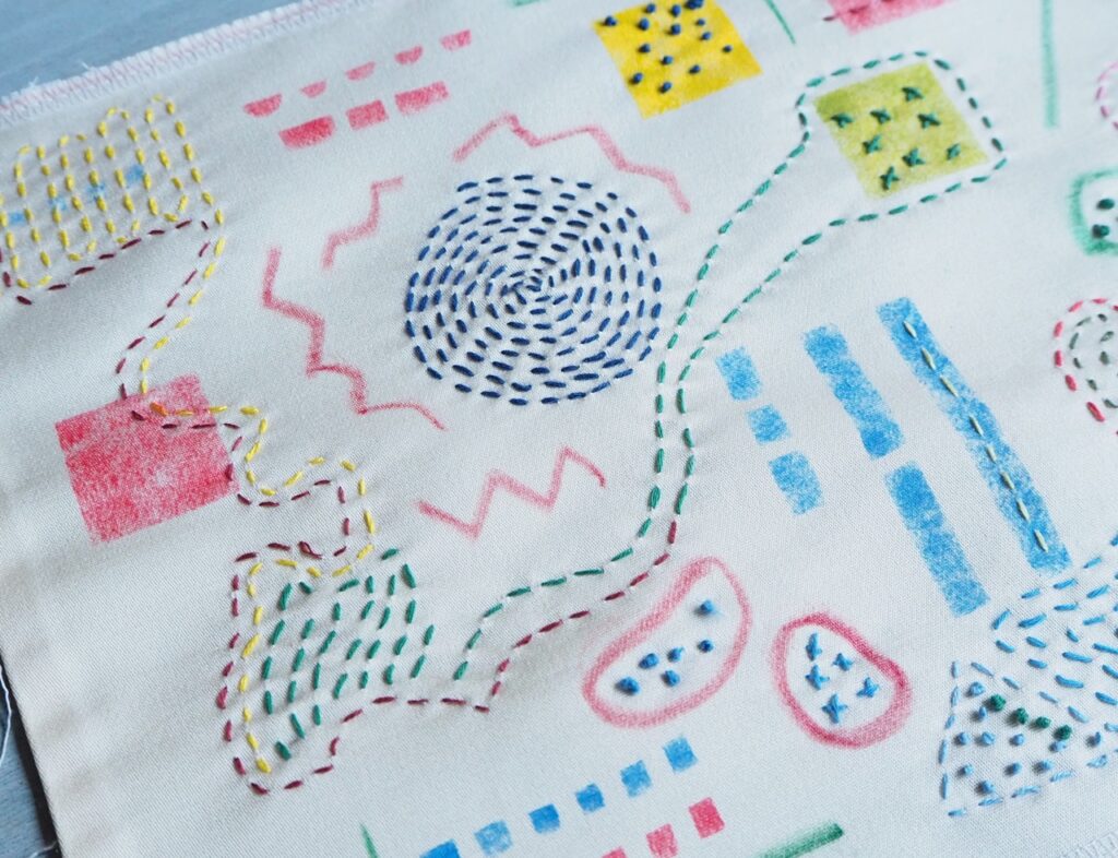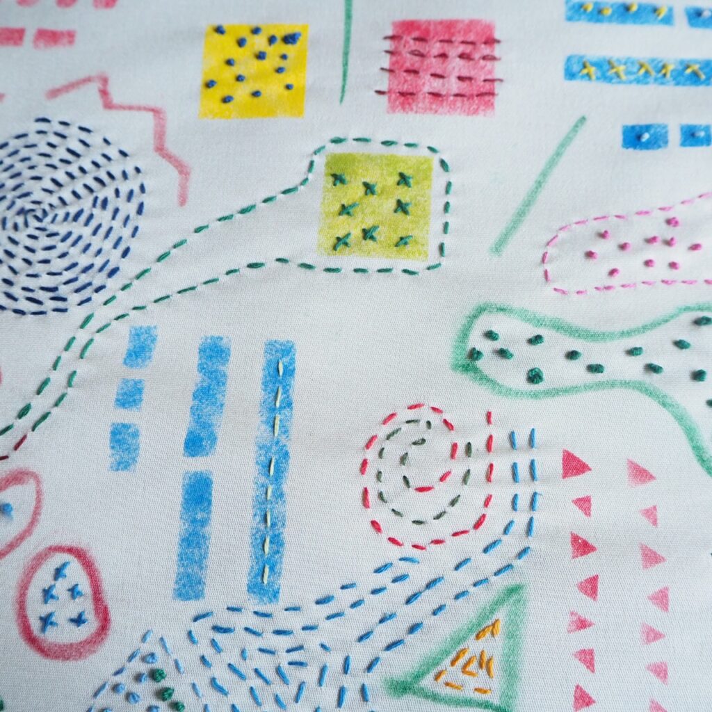 ただ、私はいろいろな色をたくさん使うのが好きです。すべて刺しゅうで埋めると単調になるので、ステンシルしたり、布地用のクレヨンを使ったりしています。